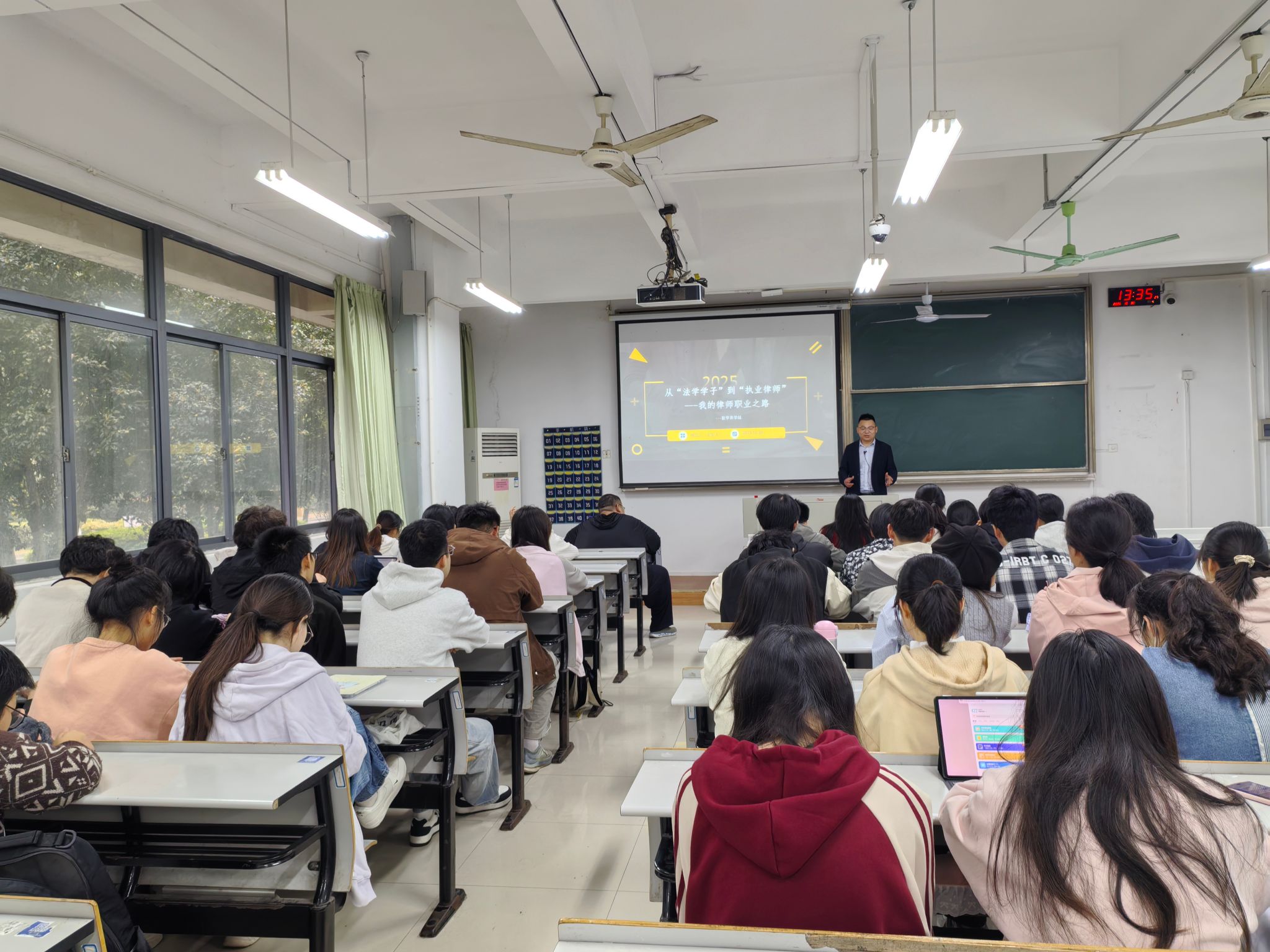 讲座伊始,宋军飞并未直接切入职业技巧,而是深情回顾了自己与法学、与嘉兴南湖学院结下的不解之缘。他坦诚分享了当年“阴差阳错”入学时的目标落差与自我怀疑,是母校扎实的专业教学和贴心的生活关怀逐渐感染了他,使其找到了归属感和方向。宋军飞特别感恩母校在其职业发展初期给予的助力,这份“意外缘分”已成为他心中珍贵的情感纽带和人生财富,也奠定了他最终选择扎根嘉兴、回馈母校的基础。