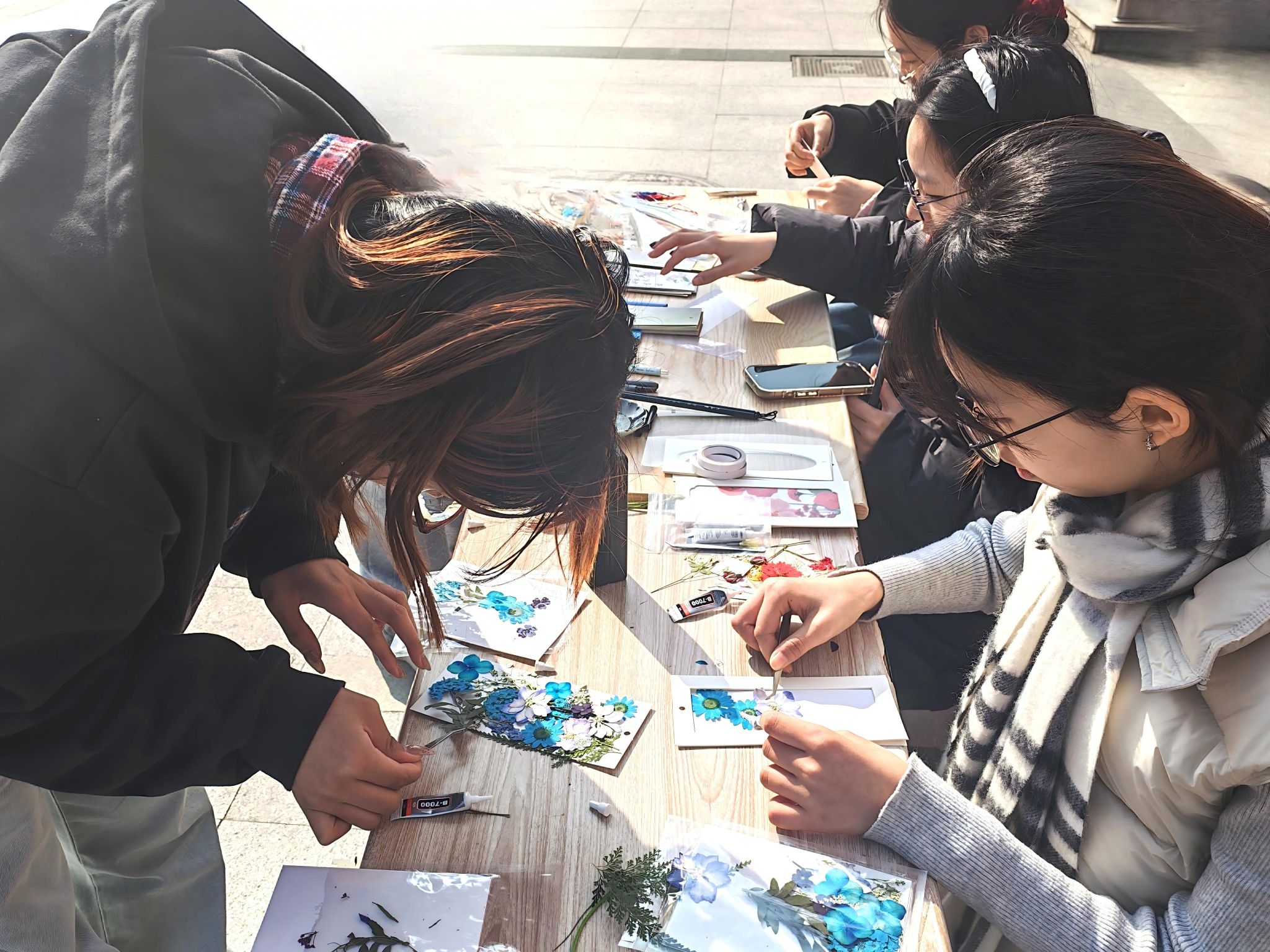 活动现场设有“干花手作”与“书法书写”两大主题体验区。在干花手作区,同学们利用主办方提供的多种干花材料及制作工具,充分发挥创意,精心构图,制作出独具匠心的干花书签。在书法书写区,参与者提笔挥毫,书写经典诗词或寄语,于笔墨之间体验传统文化魅力,寄托美好愿景。