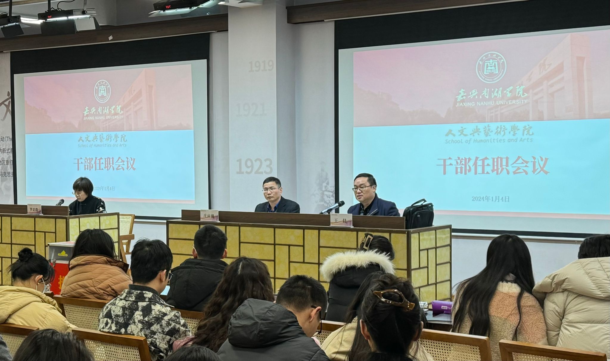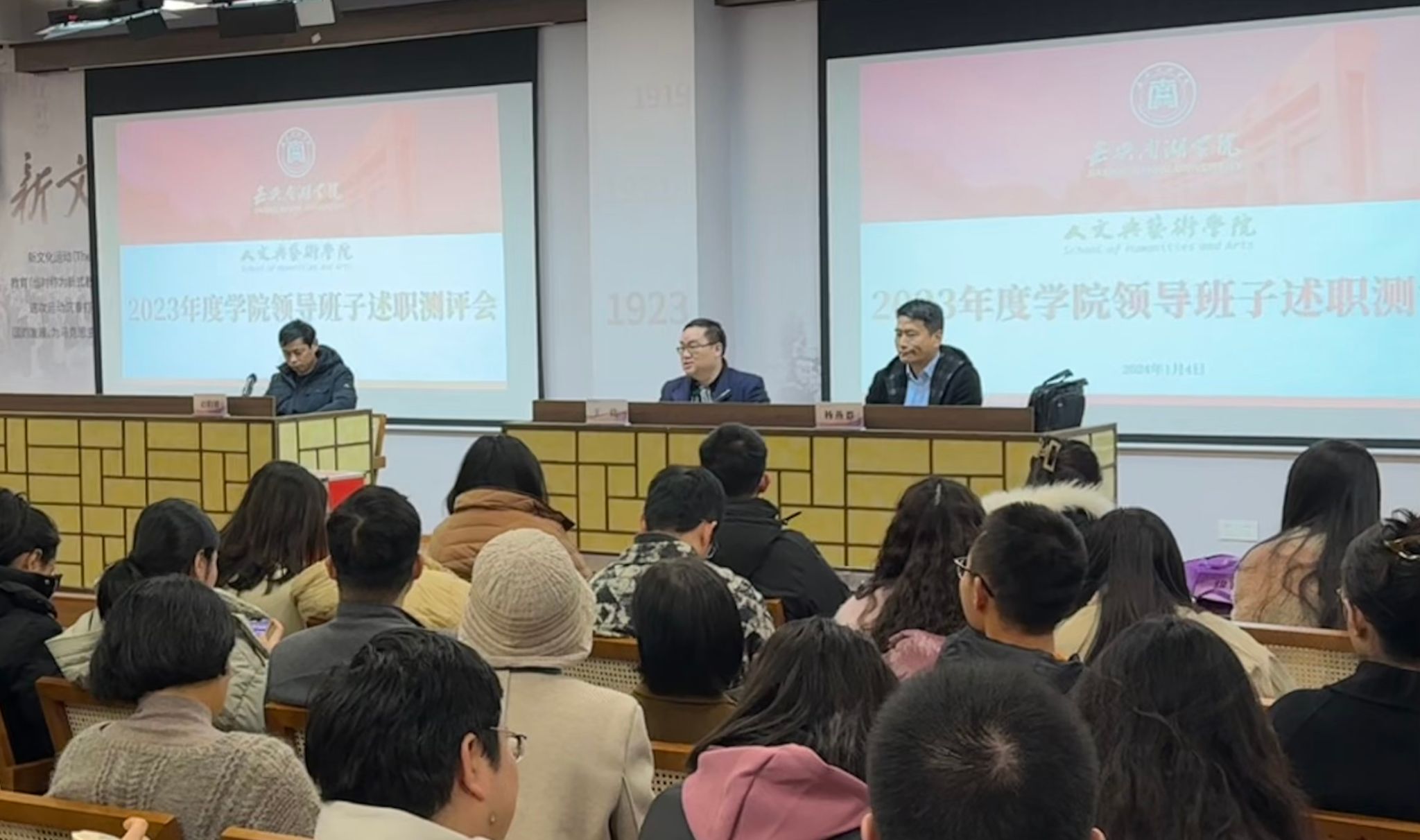 1月4日上午,人文与艺术学院在图书馆一楼报告厅召开干部任职大会暨2023年度领导干部民主测评。校党委委员、组织部部长庄应强,人文与艺术学院领导班子及全体教师参加会议。会议由学院党委书记王晨主持。