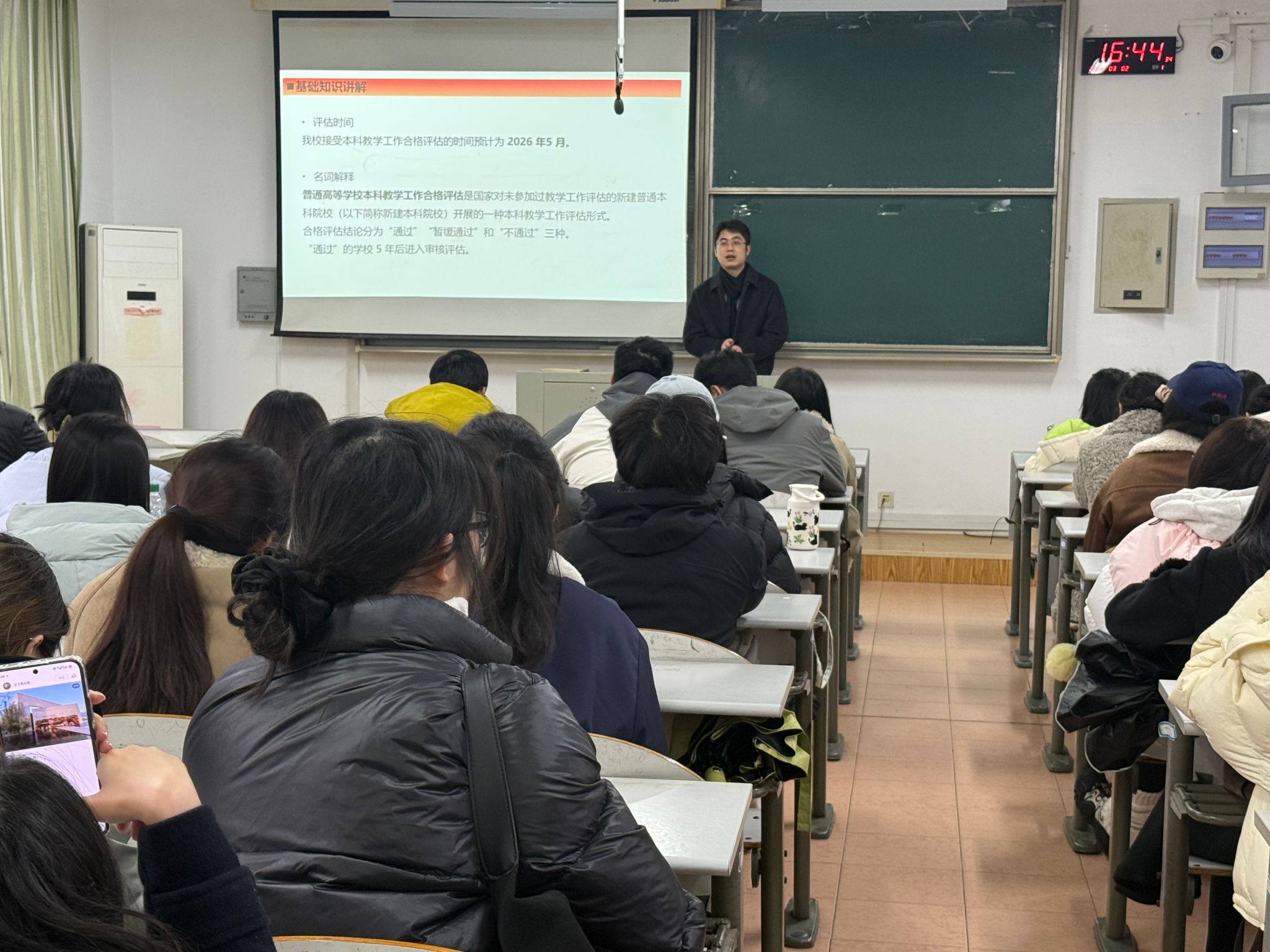本次班会覆盖全体学生,各班班主任主持班会,各专业辅导员围绕本科教学工作合格评估的背景意义、核心指标维度及基本知识点进行了专题讲解,系统阐述了评估对规范教学管理、提升培养质量、促进学院发展的重要作用,并结合学生成长实际,深入解读了评估对促进学风建设、强化专业技能、引导自我发展的长远意义。